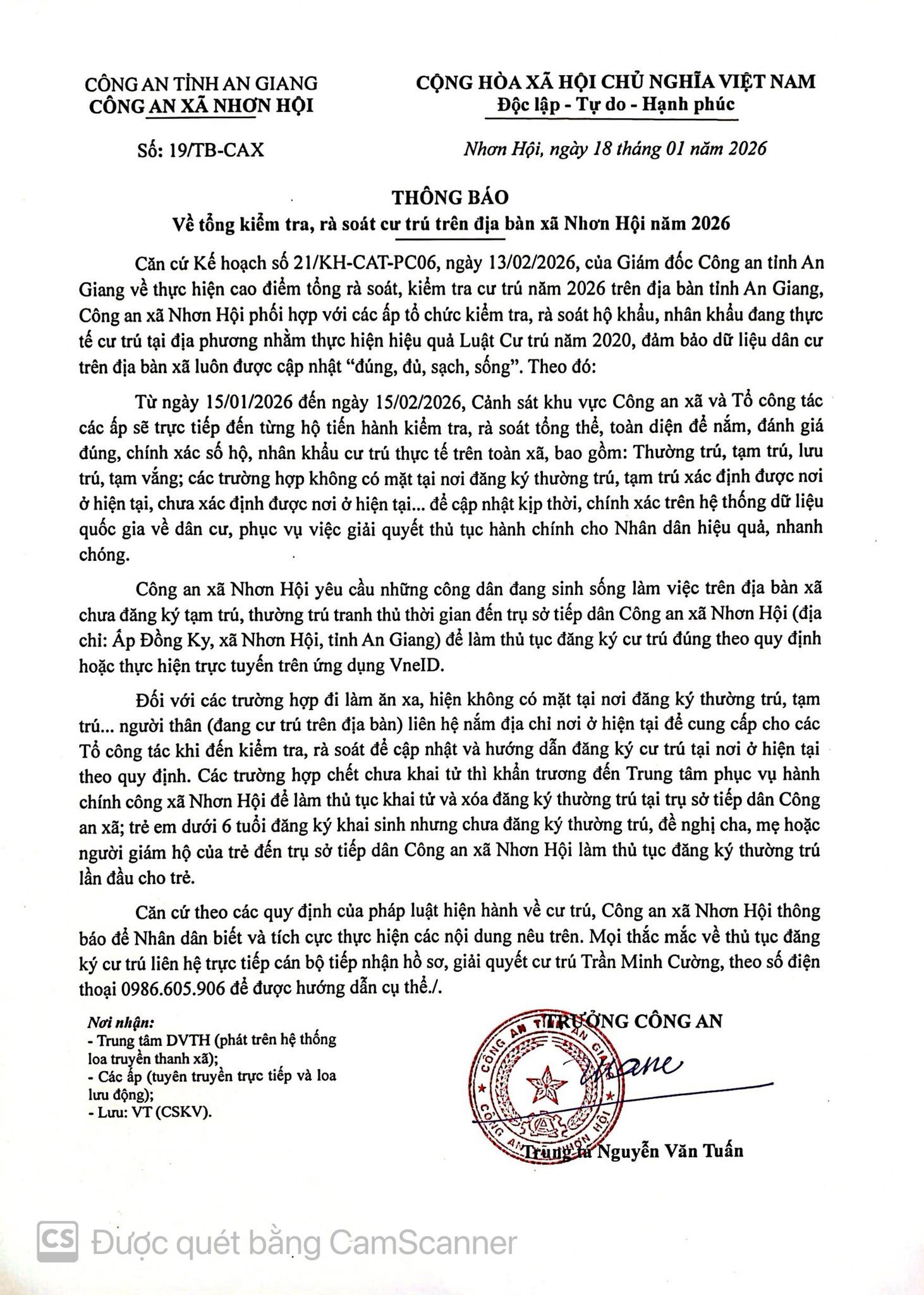 Công an xã Nhơn Hội thông báo về tổng kiểm tra, rà soát cư trú trên địa bàn xã Nhơn Hội năm 2026