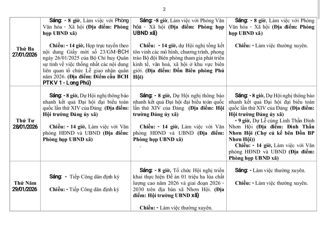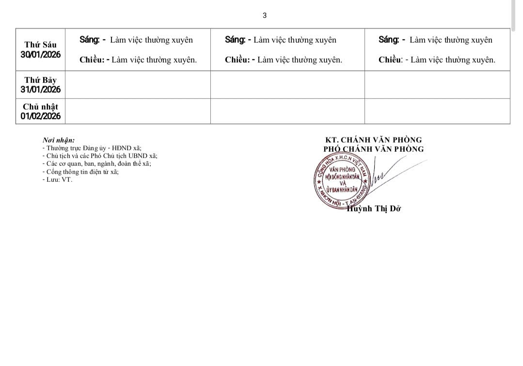 Lịch làm việc của UBND LỊCH CÔNG TÁC TUẦN CỦA UBND XÃ 28/01/2026 - aA + Submitted by Biên tập viên on 28 January 2026 Bài viết liên quan LỊCH CÔNG TÁC TUẦN CỦA UBND XÃ 04/02/2026 LỊCH CÔNG TÁC TUẦN CỦA UBND XÃ 14/01/2026