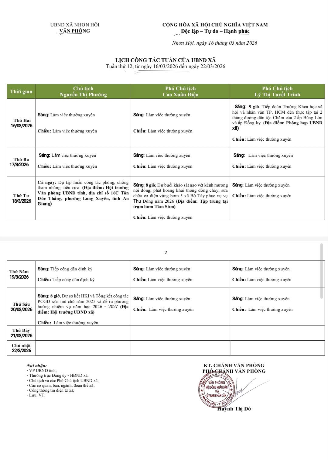 LỊCH CÔNG TÁC TUẦN CỦA UBND XÃ TỪ NGÀY 16/3/2026 ĐẾN NGÀY 22/3/2026