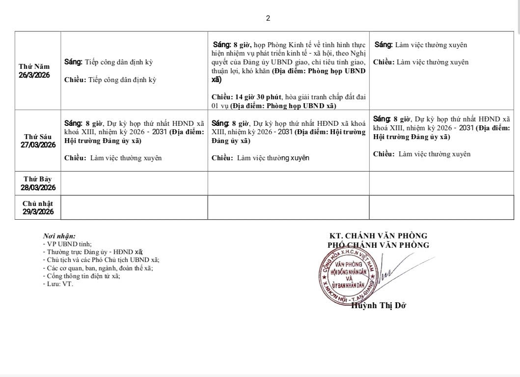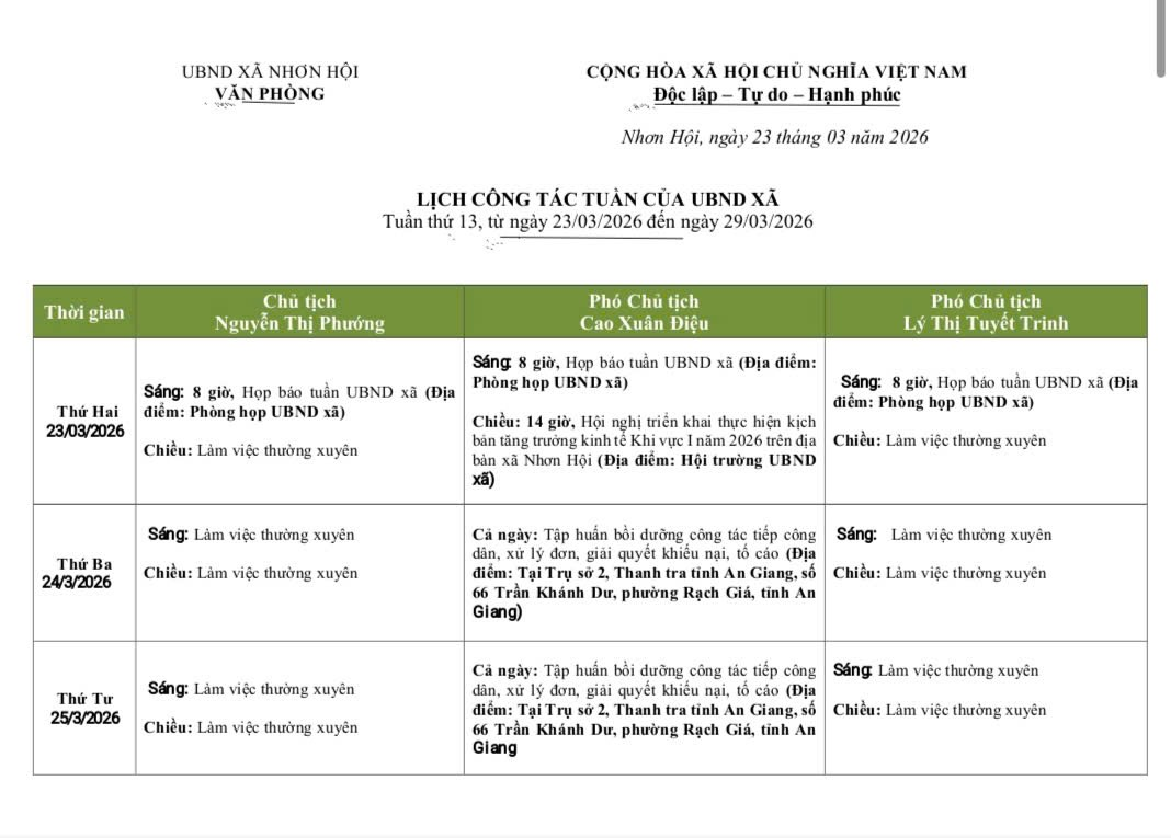 LỊCH CÔNG TÁC TUẦN CỦA UBND XÃ TỪ NGÀY 23/3/2026 ĐẾN NGÀY 29/3/2026