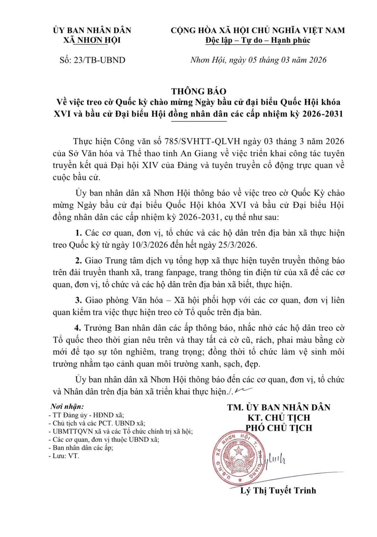 Thông báo Treo Quốc kỳ Chào mừng Ngày bầu cử đại biểu Quốc Hội khóa XVI và bầu cử đại biểu HĐND các cấp nhiệm kỳ 2026-2031