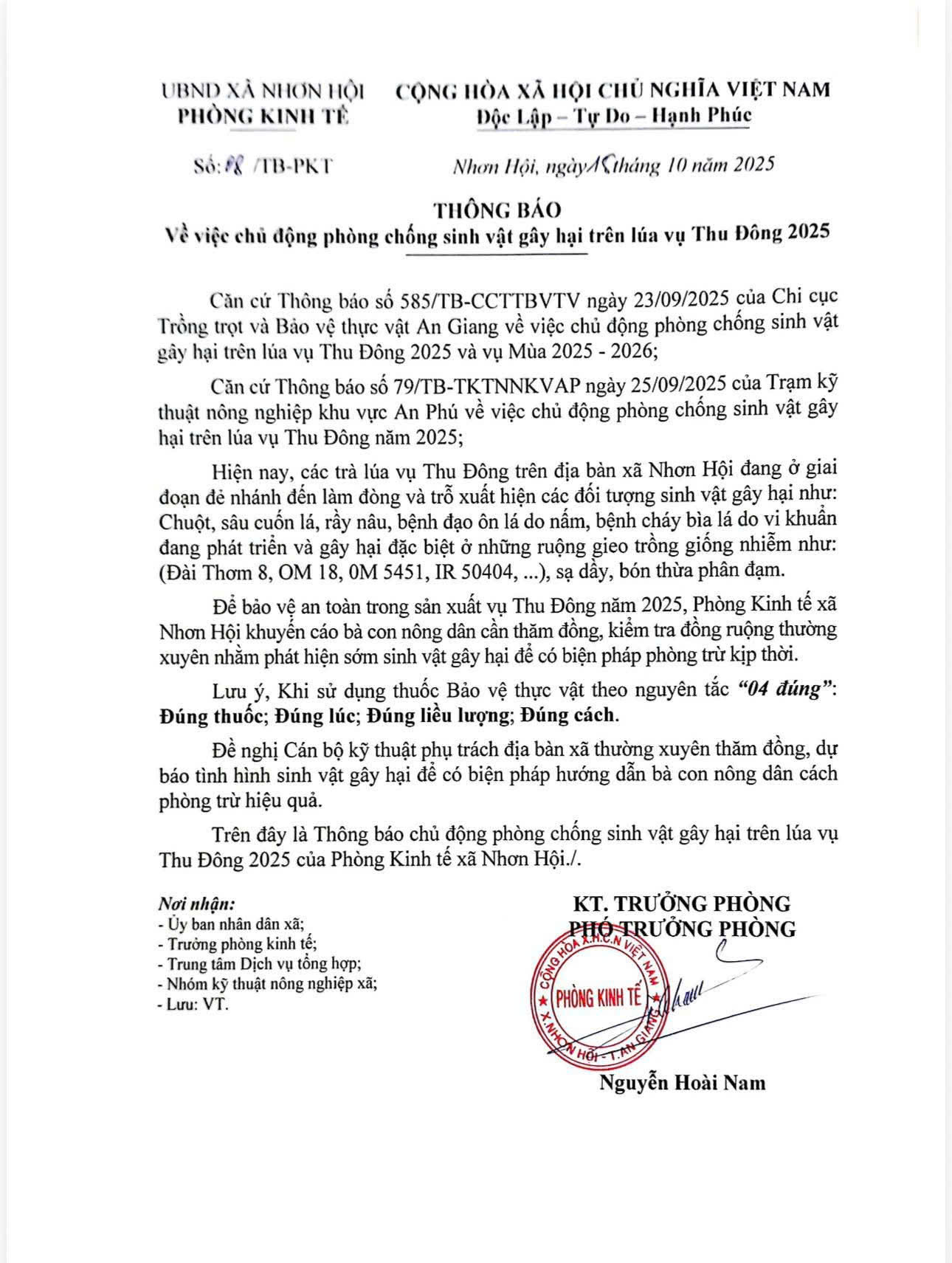 Thông báo Về việc chủ động phòng chống sinh vật gây hại trên lúa vụ Thu Đông 2025
