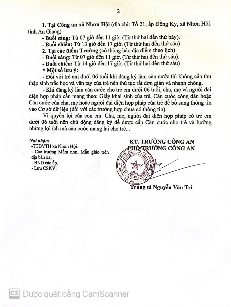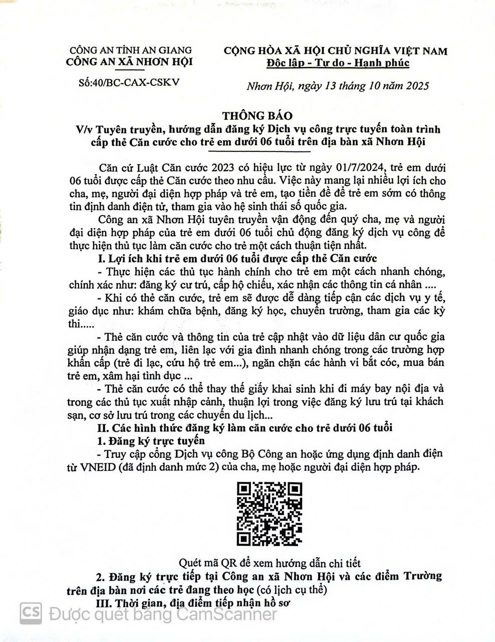 Thông báo về việc Tuyên truyền, hướng dẫn đăng ký Dịch vụ công trực tuyến toàn trình cấp thẻ Căn cước cho trẻ em dưới 06 tuổi trên địa bàn xã Nhơn Hội