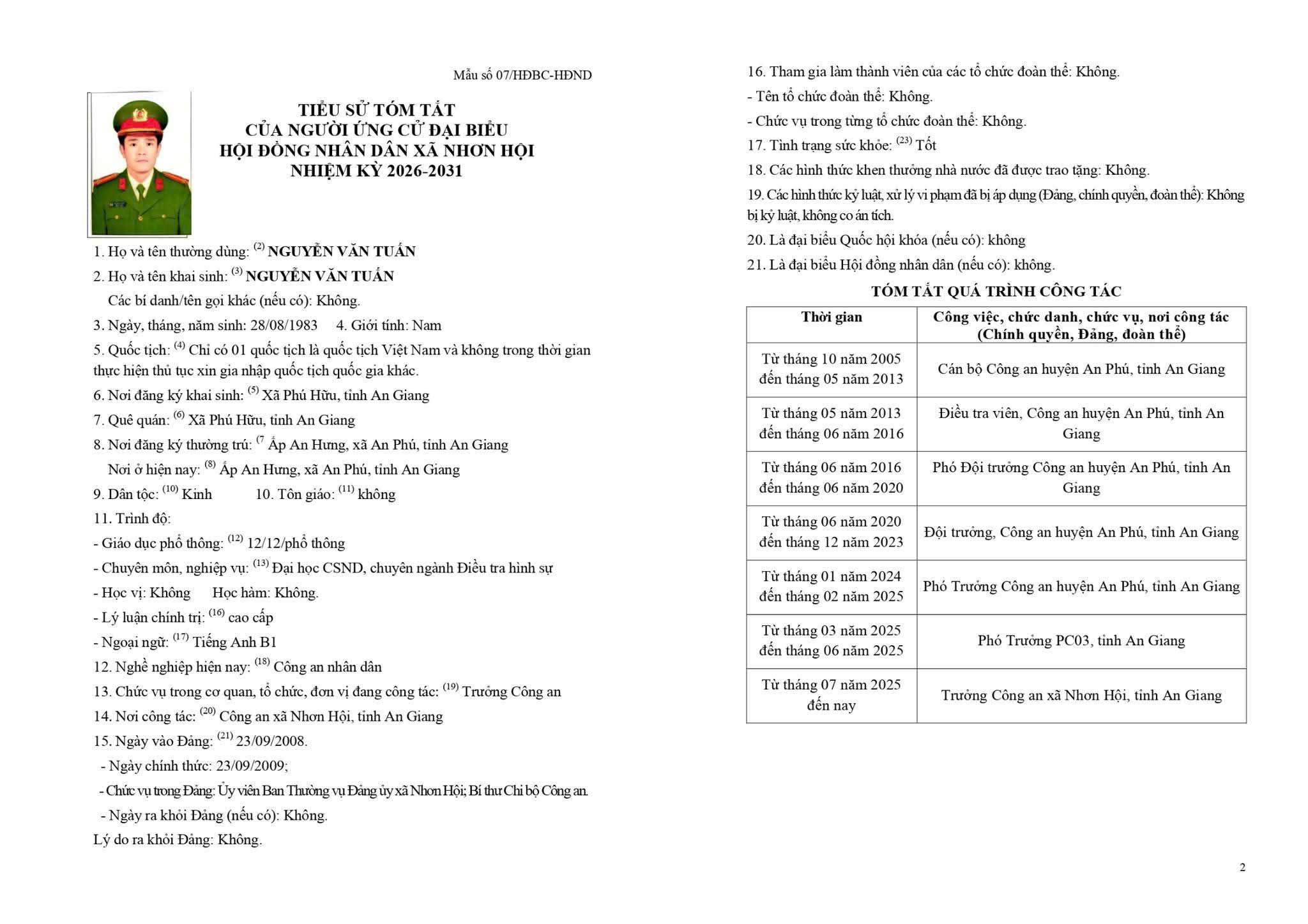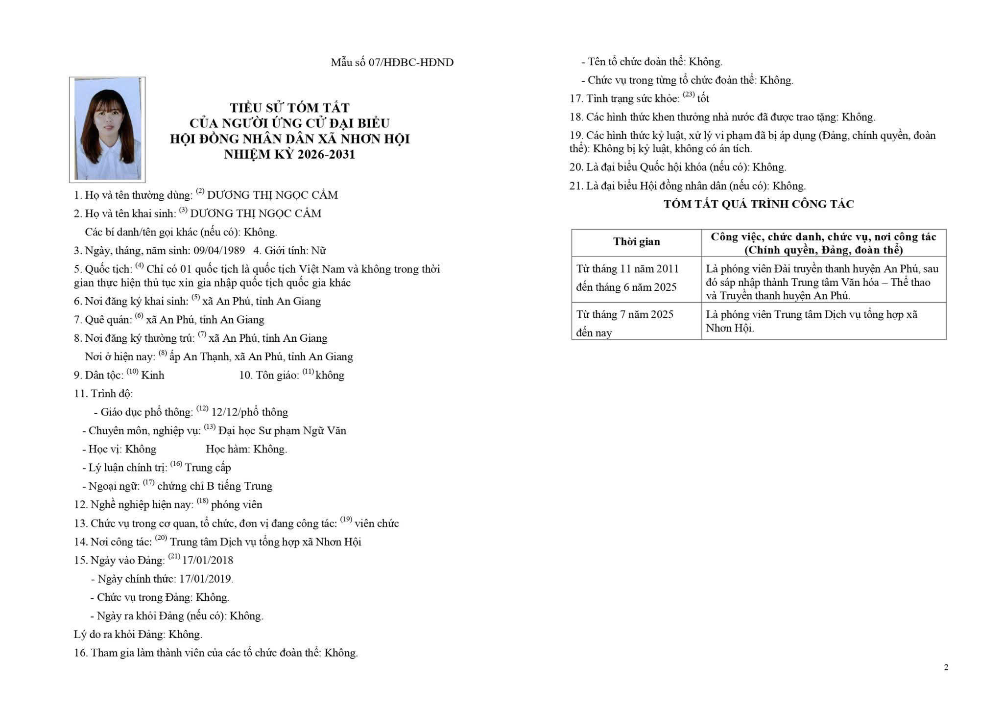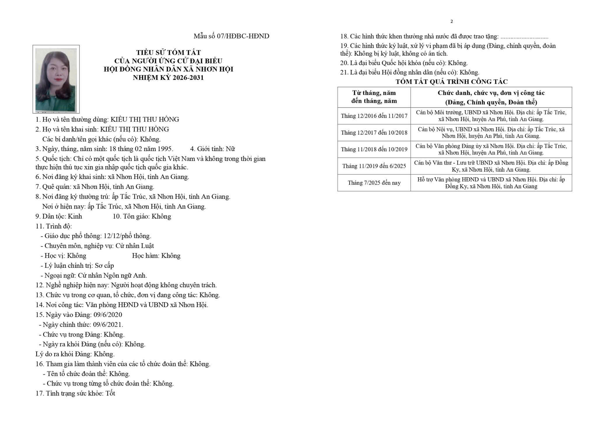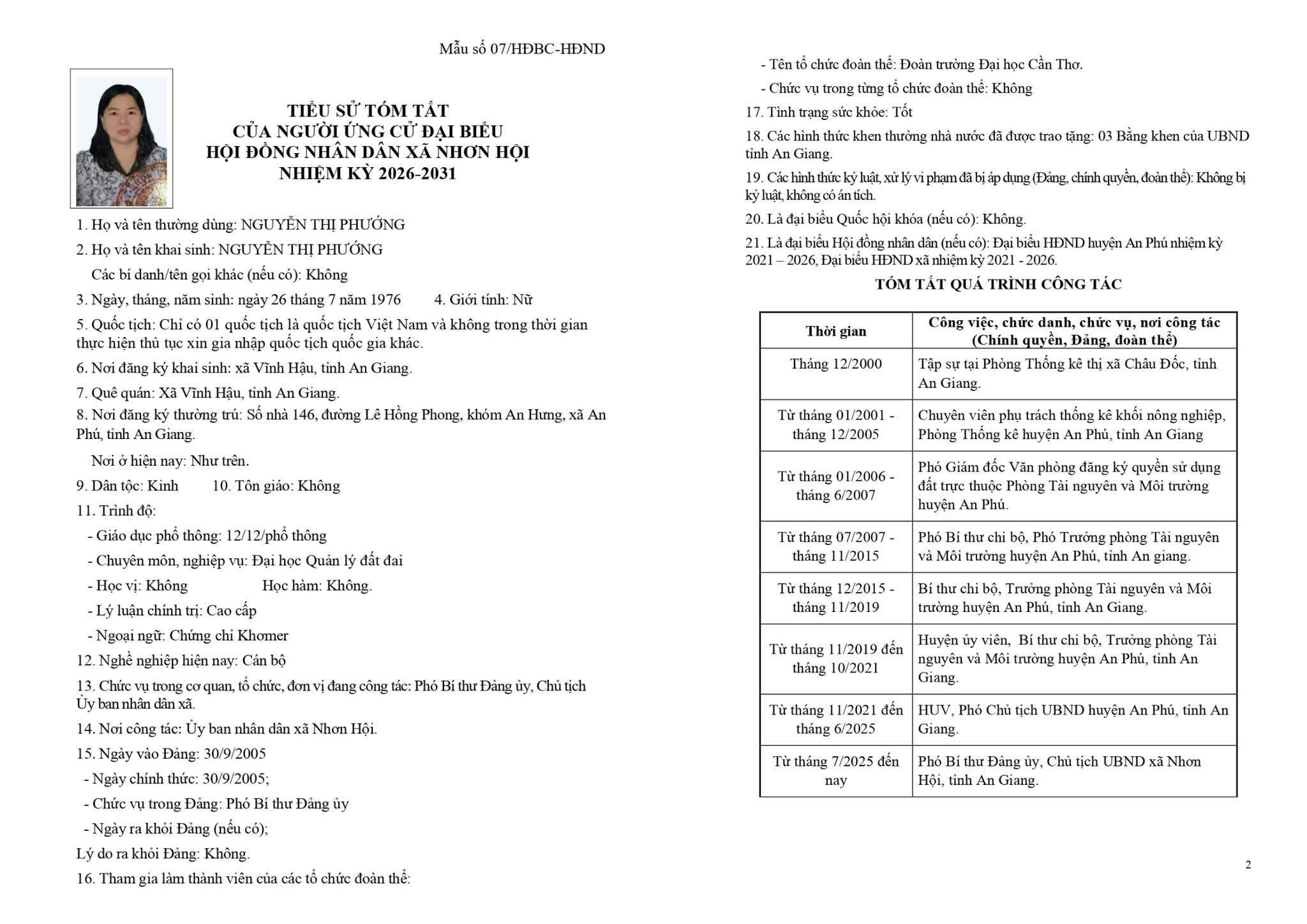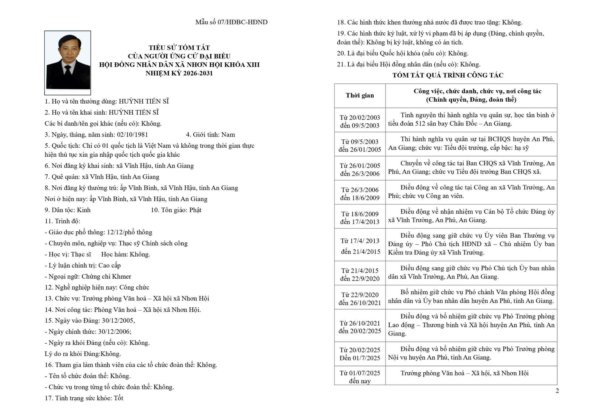 TIỂU SỬ TÓM TẮT CỦA NGƯỜI ỨNG CỬ ĐẠI BIỂU HỘI ĐỒNG NHÂN DÂN XÃ NHƠN HỘI NHIỆM KỲ 2026-2031 ĐƠN VỊ BẦU CỬ SỐ 1 GỒM: ẤP PHƯỚC KHÁNH VÀ ẤP PHƯỚC HÒA