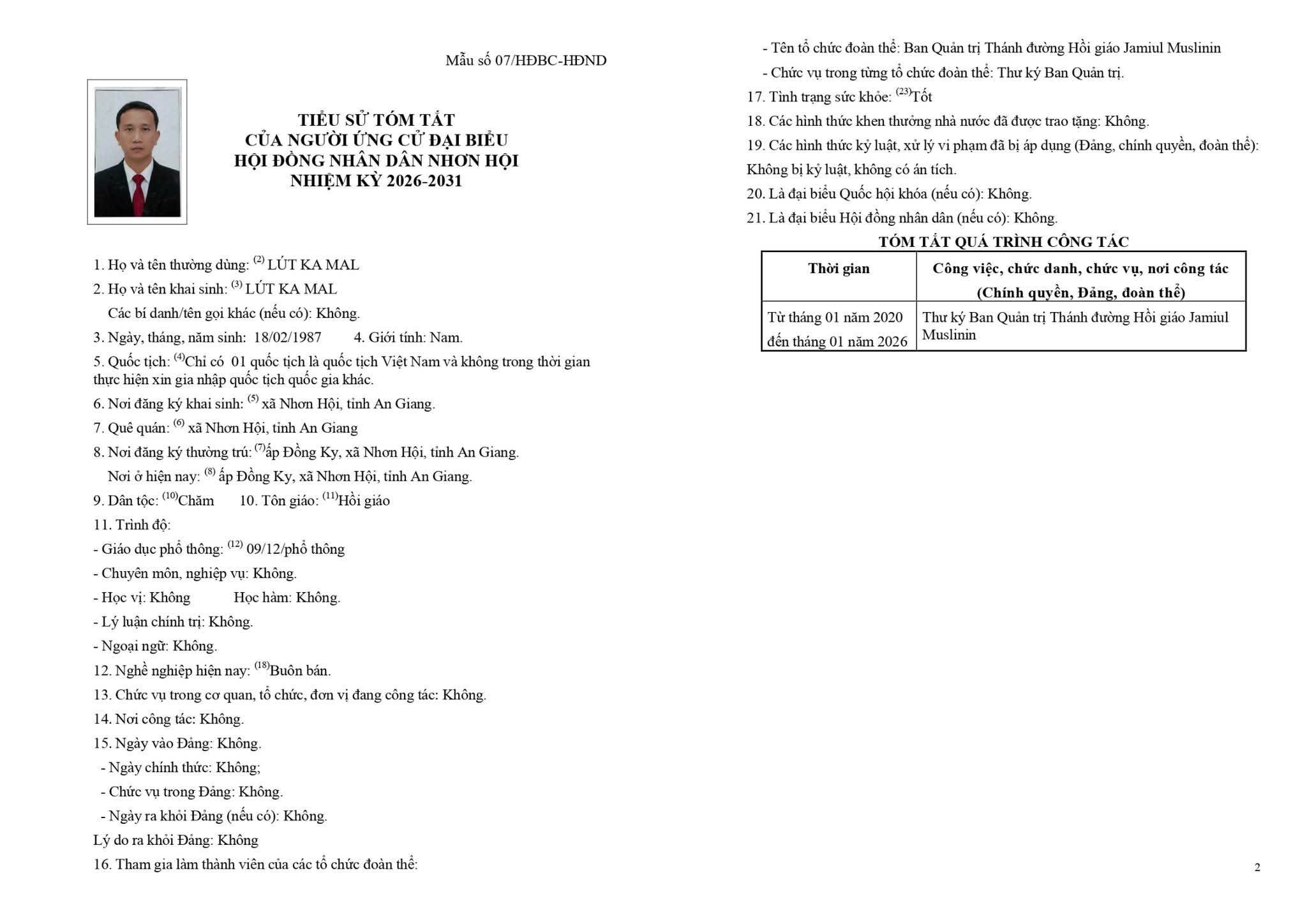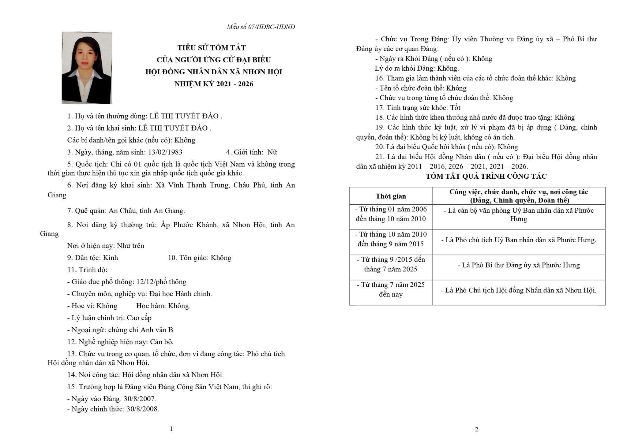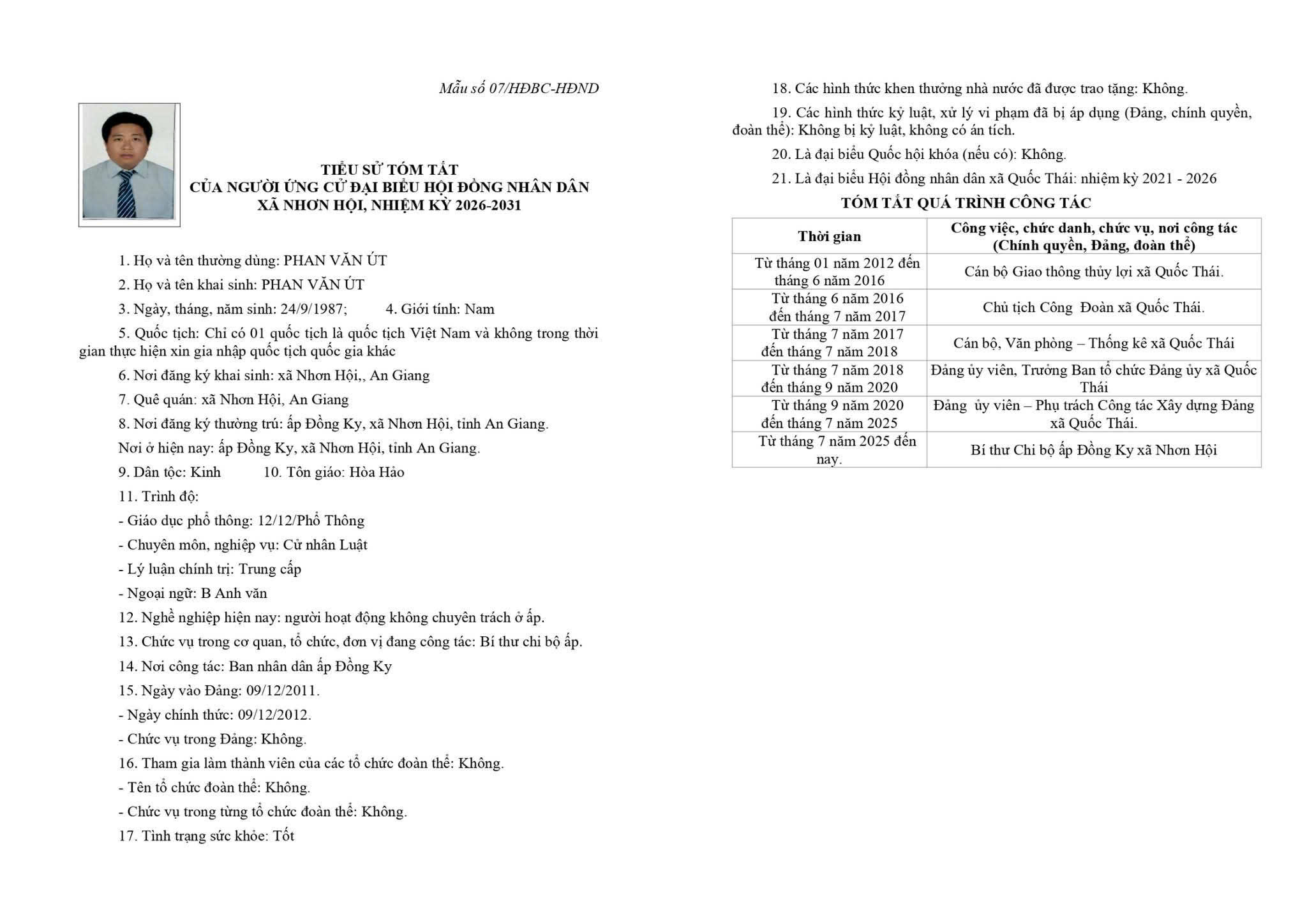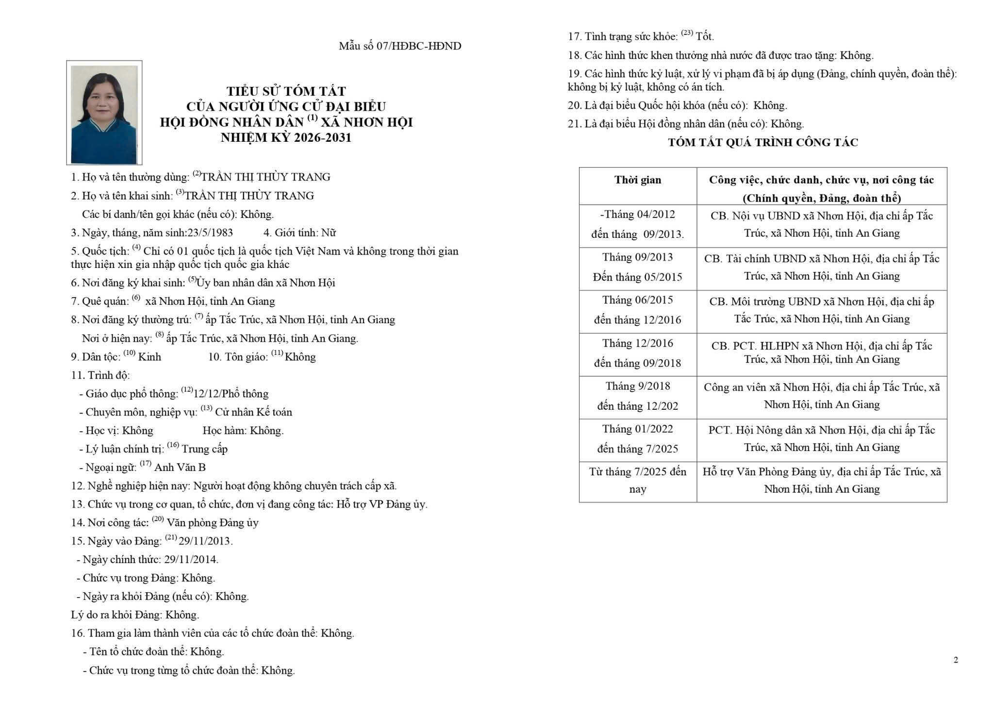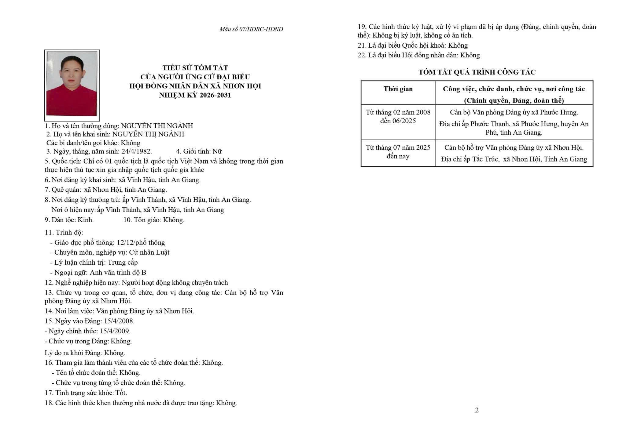 TIỂU SỬ TÓM TẮT CỦA NGƯỜI ỨNG CỬ ĐẠI BIỂU HỘI ĐỒNG NHÂN DÂN XÃ NHƠN HỘI NHIỆM KỲ 2026-2031 ĐƠN VỊ BẦU CỬ SỐ 3 GỒM: ẤP ĐỒNG KY