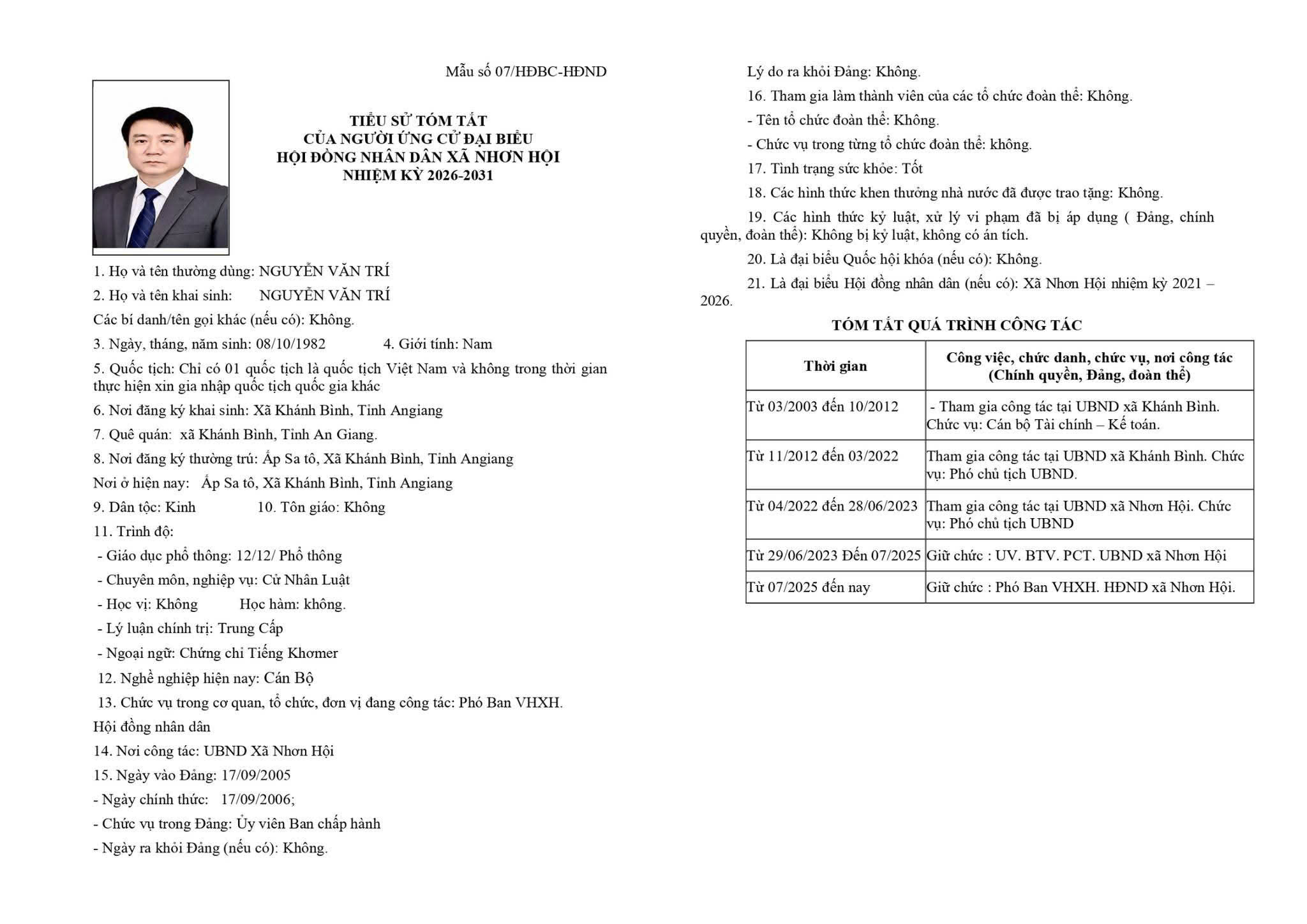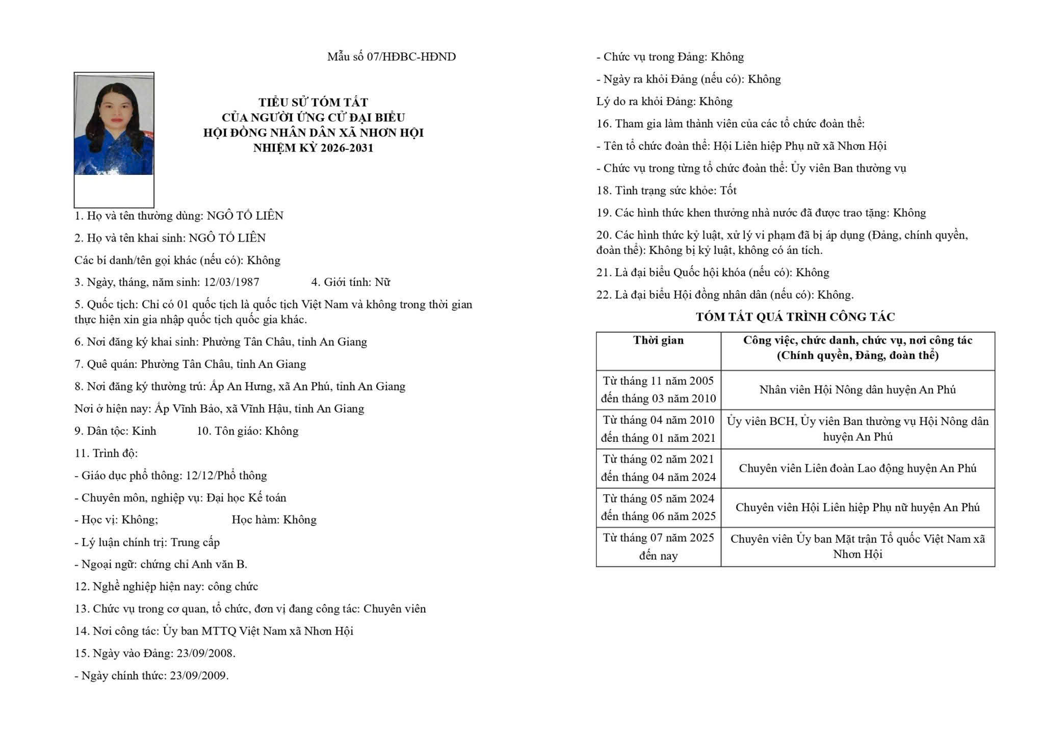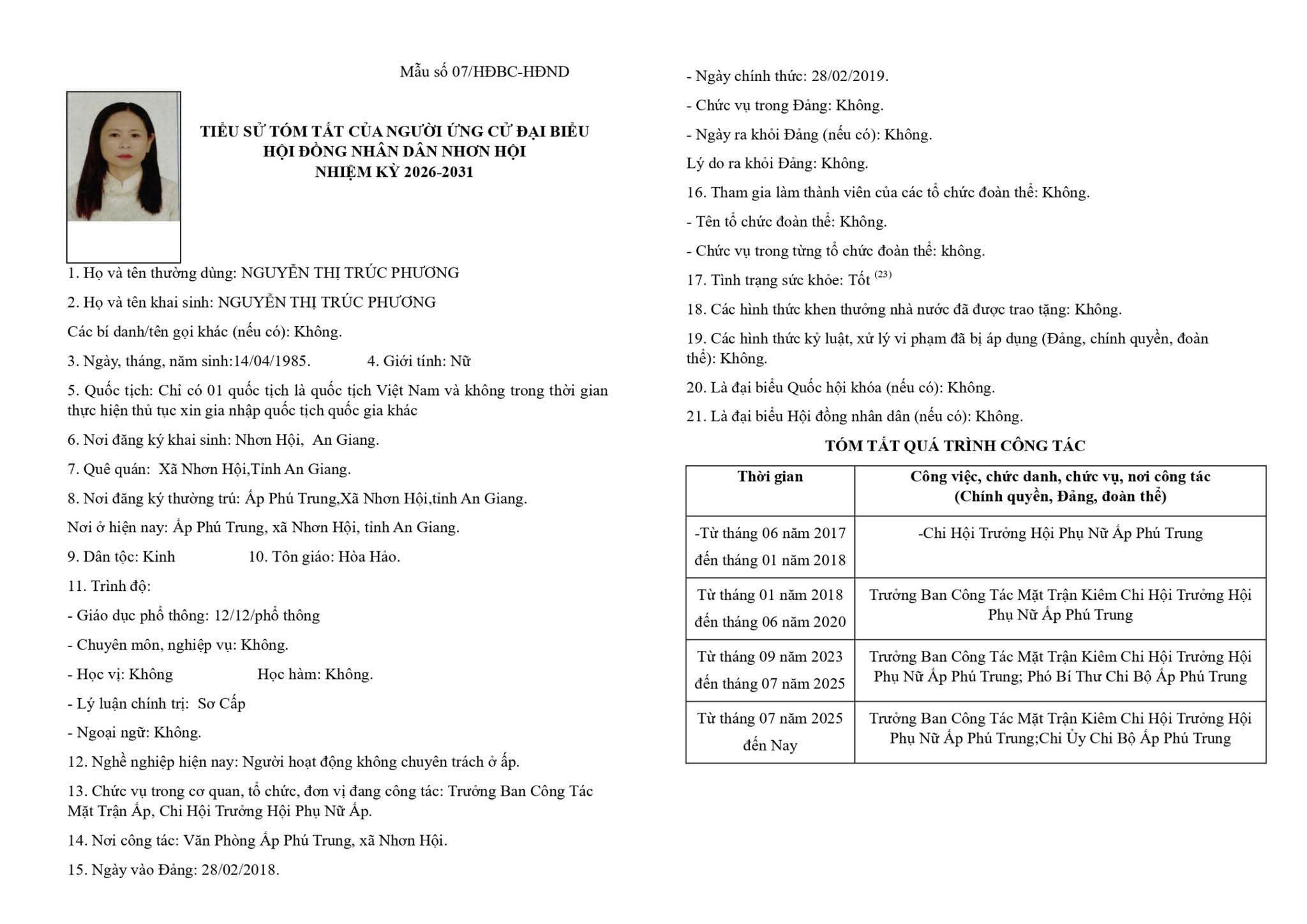 TIỂU SỬ TÓM TẮT CỦA NGƯỜI ỨNG CỬ ĐẠI BIỂU HỘI ĐỒNG NHÂN DÂN XÃ NHƠN HỘI NHIỆM KỲ 2026-2031 ĐƠN VỊ BẦU CỬ SỐ 6 GỒM: ẤP TẮC TRÚC
