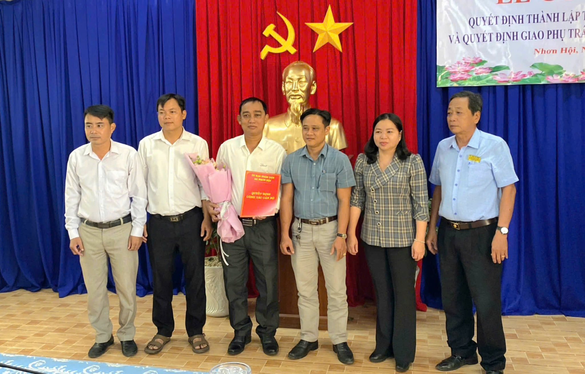 May be an image of dais and text that says "ỦY BAN NHÂN DÂN XÃ NHƠN HỘI LỄ CÔNG BỐ QUYẾT ĐỊNH THÀNH LẬP TRẠM TÉ XÃ NHƠN HỘI VÀ QUYẾT ĐỊNH GIAO PHỤ TRÁCH TRẠMY TRẠMYTÉX QUYETRNHGLOPHUTRİCHIR,NYTEXTNWOAH TÉ XÃ NHƠN HỘI Nhơn Hội, Ngày 07 Tháng 01 Năm 2026"